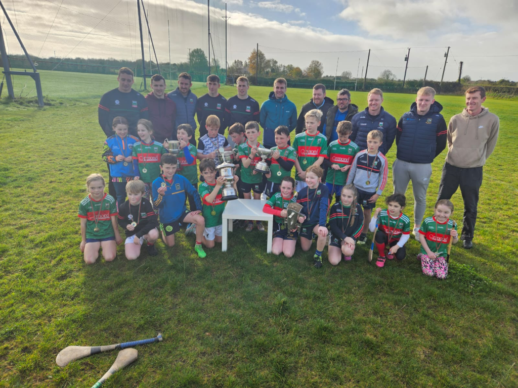 After the excitement of last weekend on the playing fields, the week just ended has been all about celebrations. After a terrific homecoming on Sunday night in the hall, the party moved to Castleiney on Monday and a fabulous day and night was enjoyed by the huge crowd that gathered throughout the day. Once again Denis O Reilly of Premier Meats provided top class food and Nolan’s kept everyone hydrated!! Denis has been a great supporter of the club this year and his presence has added enormously to all our victory celebrations. Loughmore and Castleiney schools were also visited and the kids really enjoyed holding the most famous trophies in Tipperary GAA. A big number of the players also brought the silverware to juvenile training on Saturday and the young stars all received medals for their efforts during the year. The Dan Breen and O Dwyer cups also visited the 1973 senior football Captain Tom Hayes at his home in Cashel and he proudly lifted the cup and congratulated all concerned in a lovely speech.